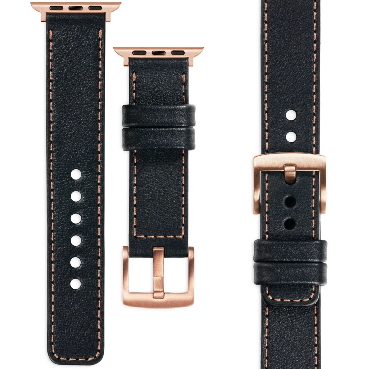 moVear Prestige C1 22mm Schwarz Lederarmband für Apple Watch 10 / 9 / 8 / 7 / 6 / 5 / 4 / SE (42/41/40mm) | Schwarz Nähte [Größen XS-XXL und Schnalle zur Auswahl]