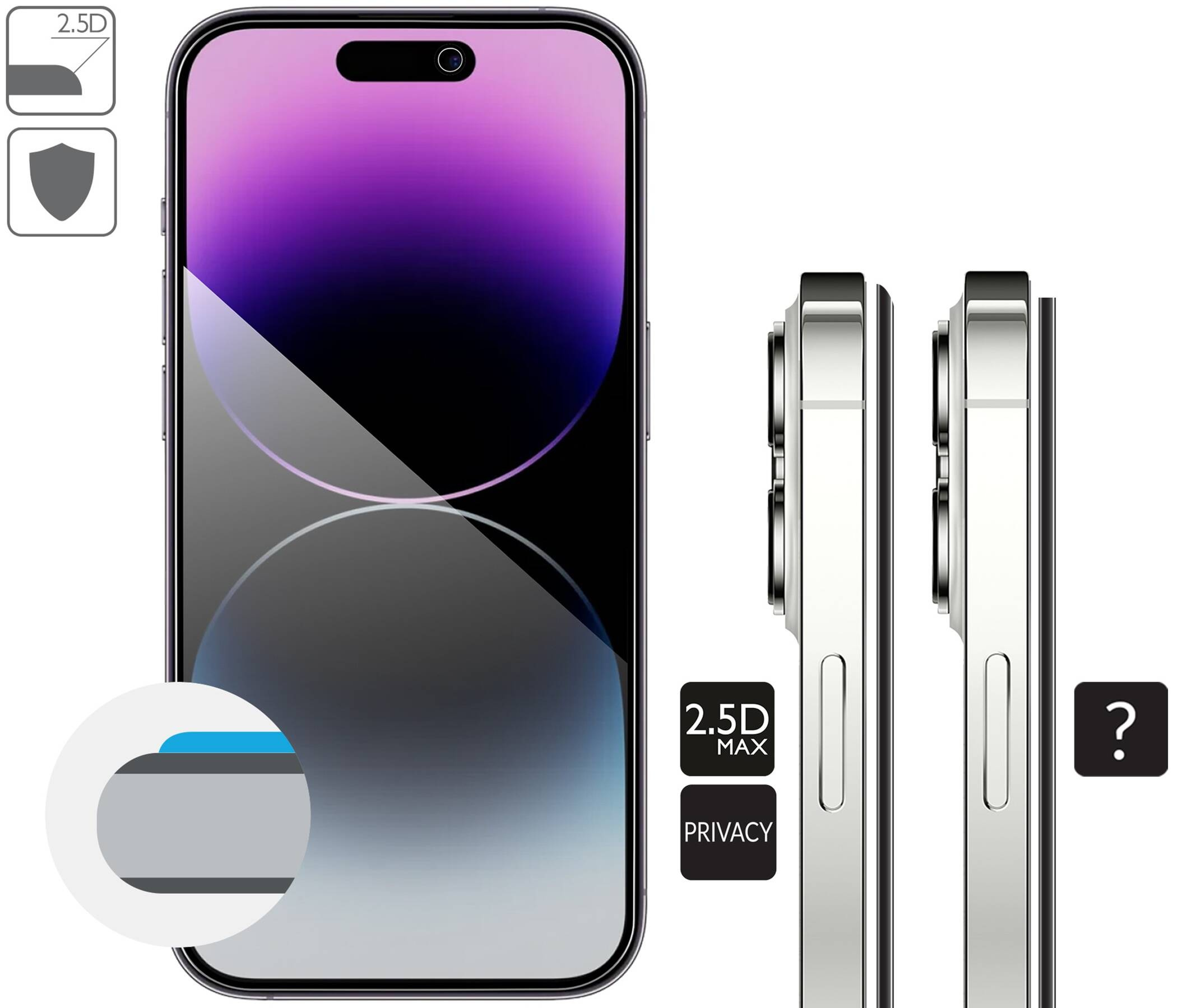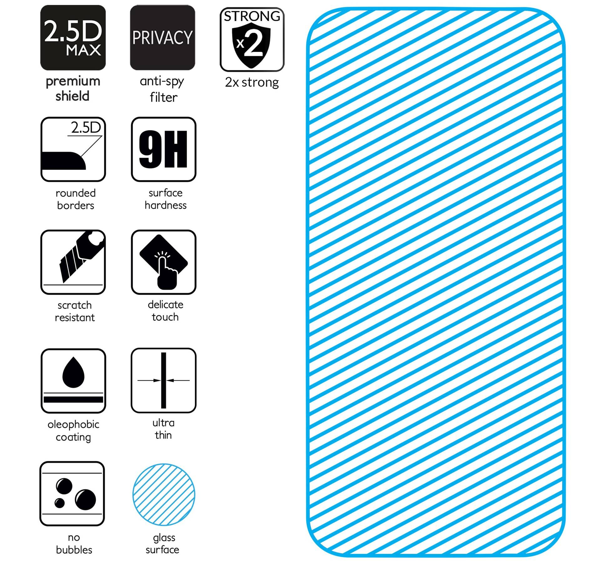 NOTE! Today, many modern smartphones have screens that have a slightly curved surface. The 2.5D MAX privacy glass is larger than the classic 2.5D glass and at the same time slightly smaller than the 3D glass. So it is compatible with more smartphone cases.