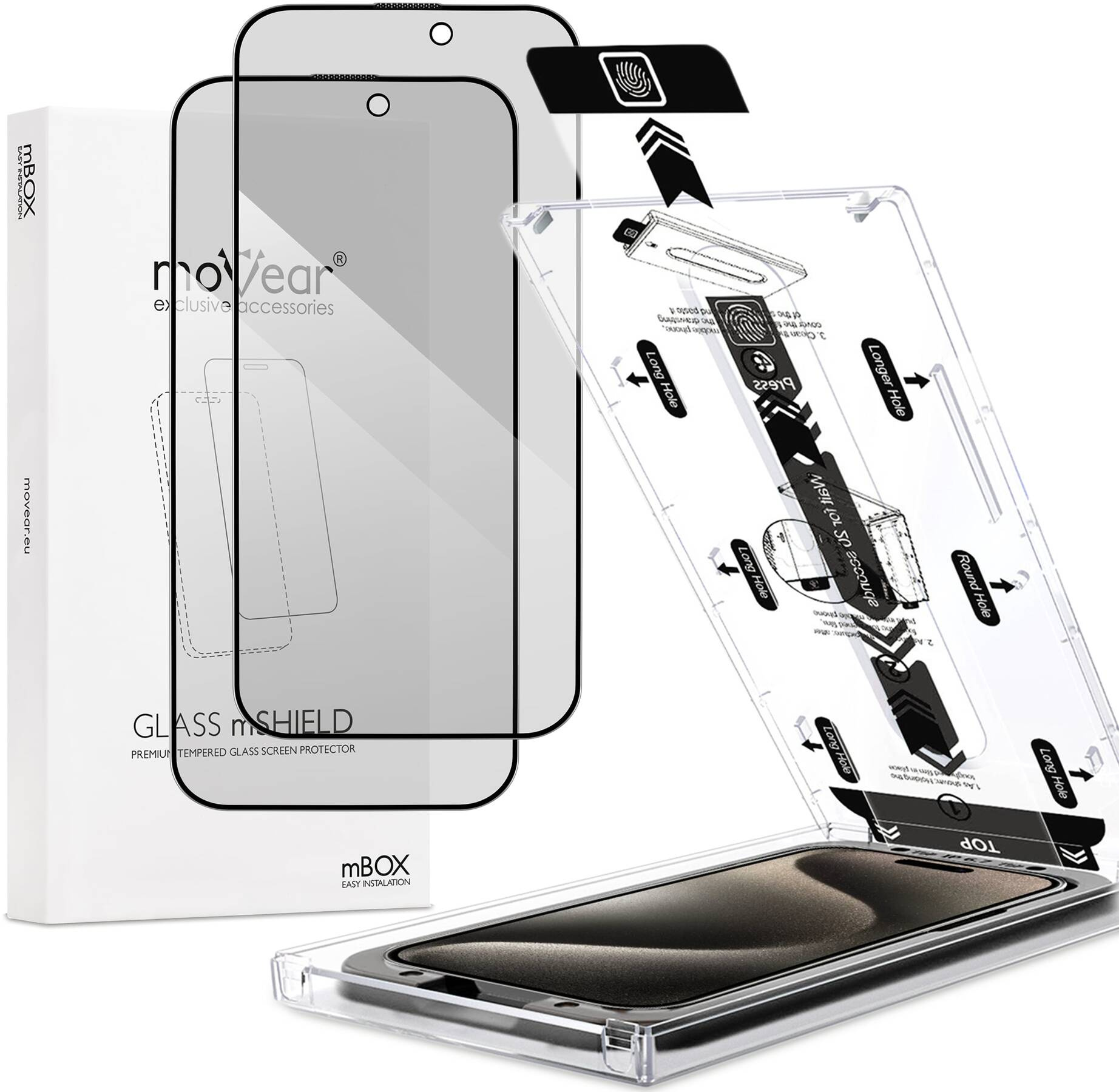 - 2 pcs. moVear mBOX GLASS mSHIELD 2.5D MAX privacy tempered glass for the iPhone 15 Pro (6.1")