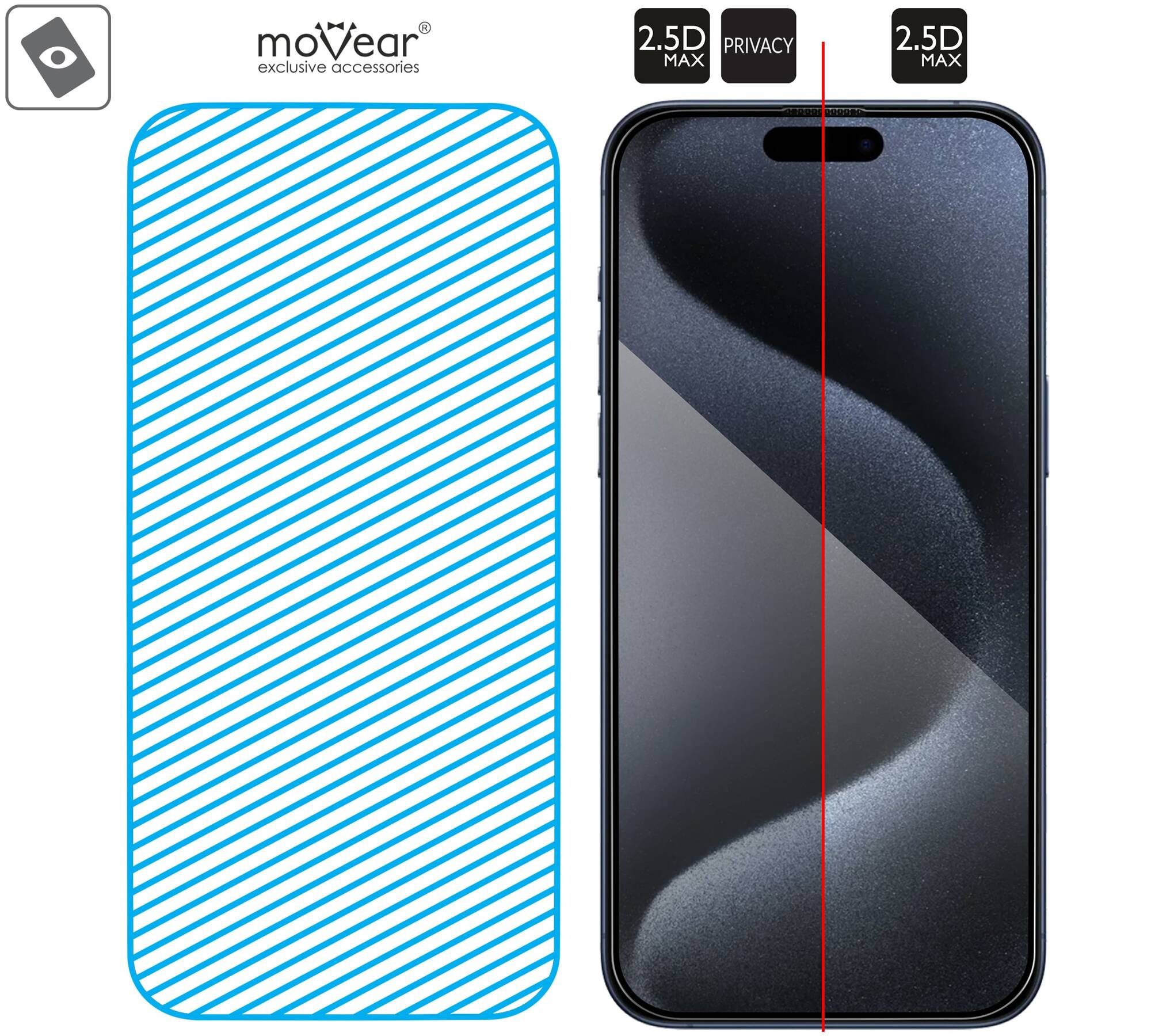 - 2 pcs. moVear mBOX GLASS mSHIELD 2.5D MAX privacy tempered glass for the iPhone 15 Pro Max