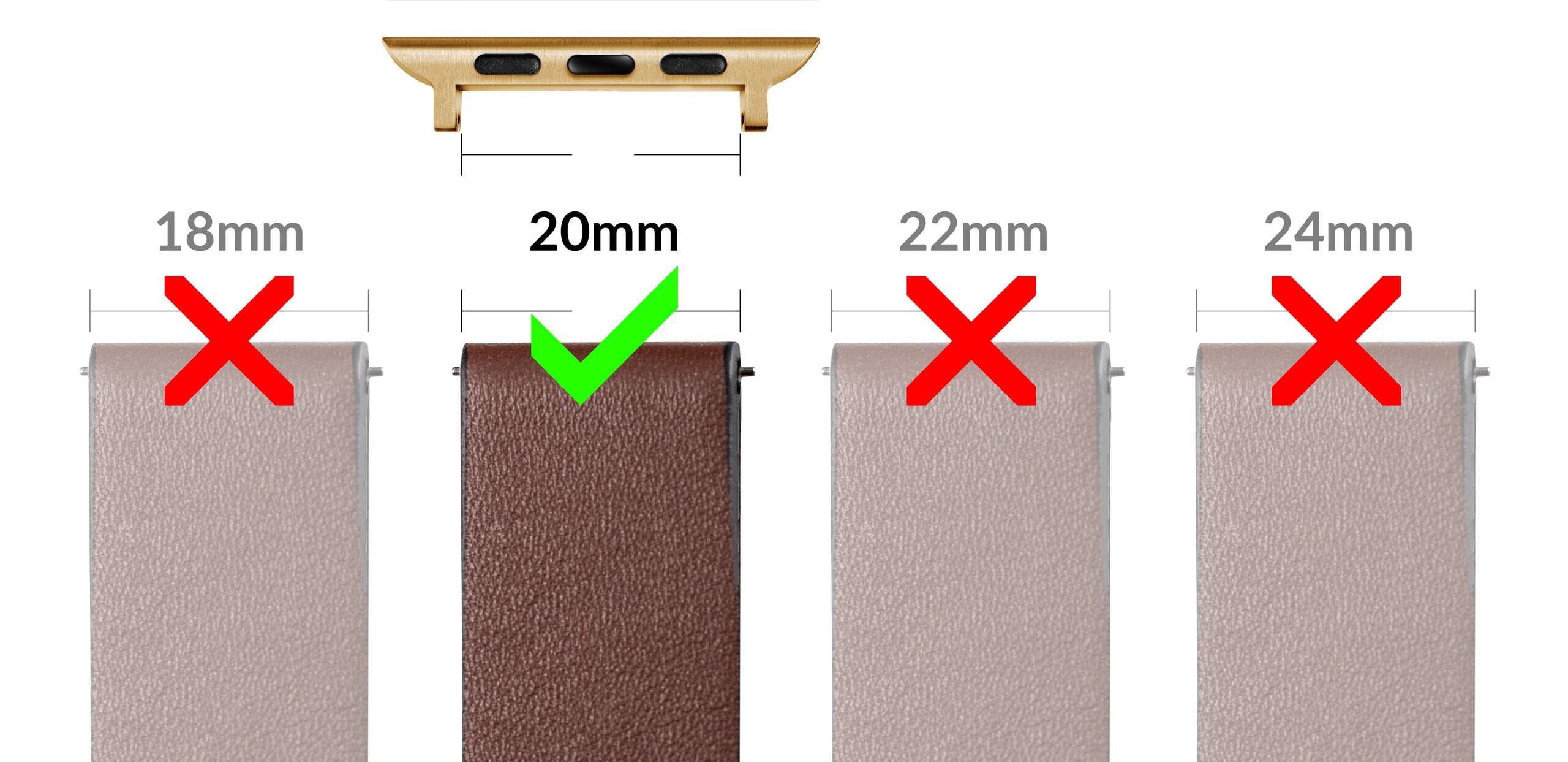 The moVear adapter allows you to use a classic watch strap (with a pin / telescope mounting) with a 20mm mounting width on the Apple Watch 41/40/38mm watch. Carefully verify the width of the watch strap.