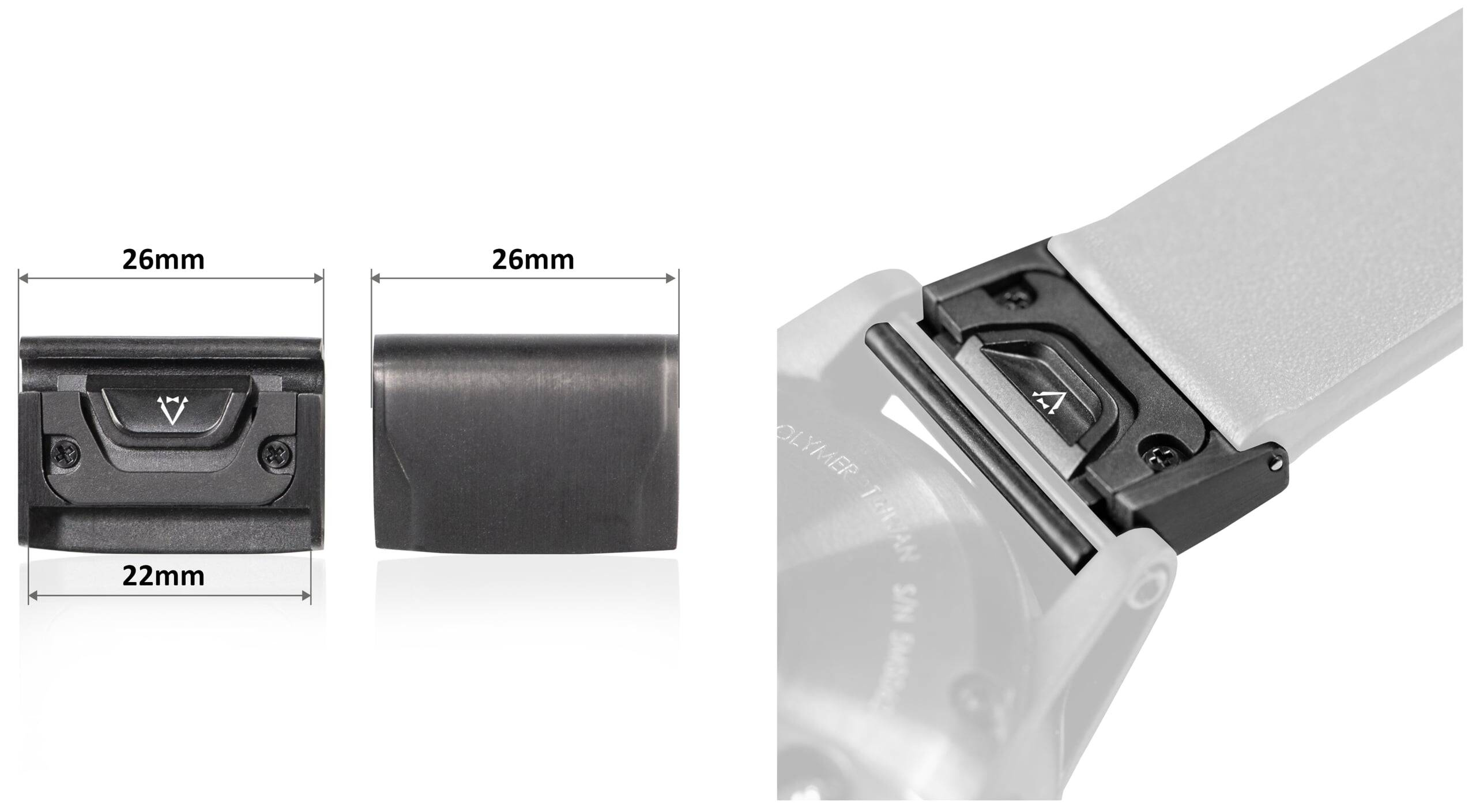 It fits perfectly with classic watch straps with a fastening width of 22mm. Allows attaching a 22mm strap to watches with a 26mm Garmin QuickFit mount .