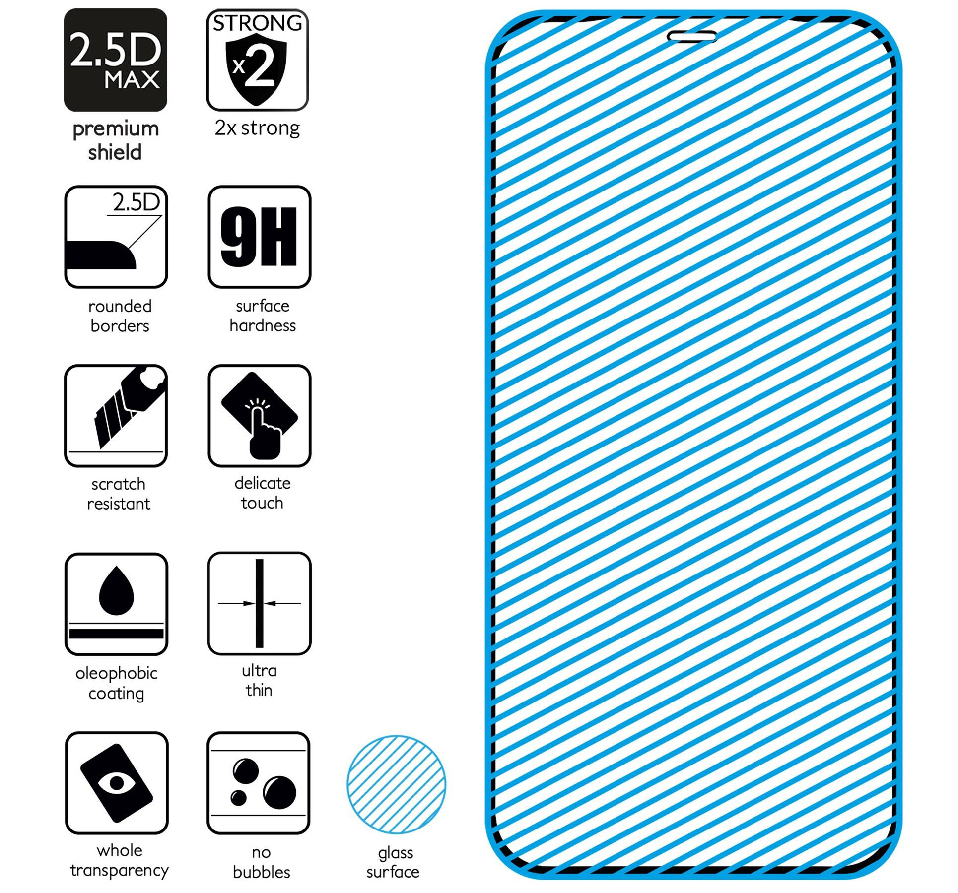 NOTE! Today, many modern smartphones have screens that have a slightly curved surface. The 2.5D MAX glass is larger than the classic 2.5D glass and at the same time slightly smaller than the 3D glass. So it is compatible with more smartphone cases.