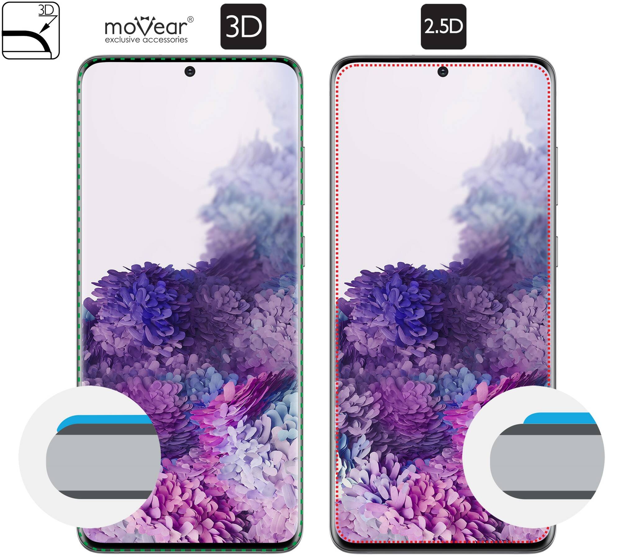 The appearance and size of the glass on the phone br /> The picture on the right shows what area of the screen is covered by moVear GLASS mSHIELD 3D and 2.5D glass for the Samsung S20 (6.2").