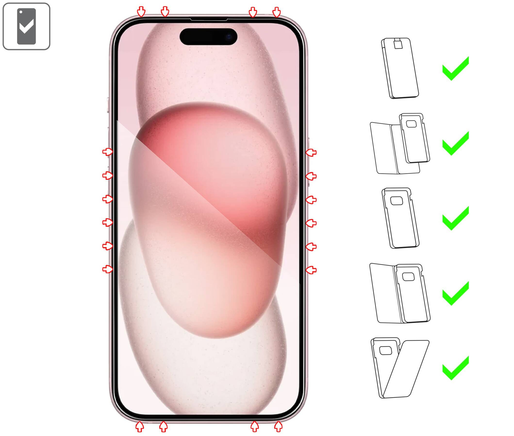 The combination of layers reduces the susceptibility to cracks and crushing. It absorbs impact energy, protects the Apple iPhone 16 / 15 screen and reduces the risk of damage to the display when the smartphone falls.