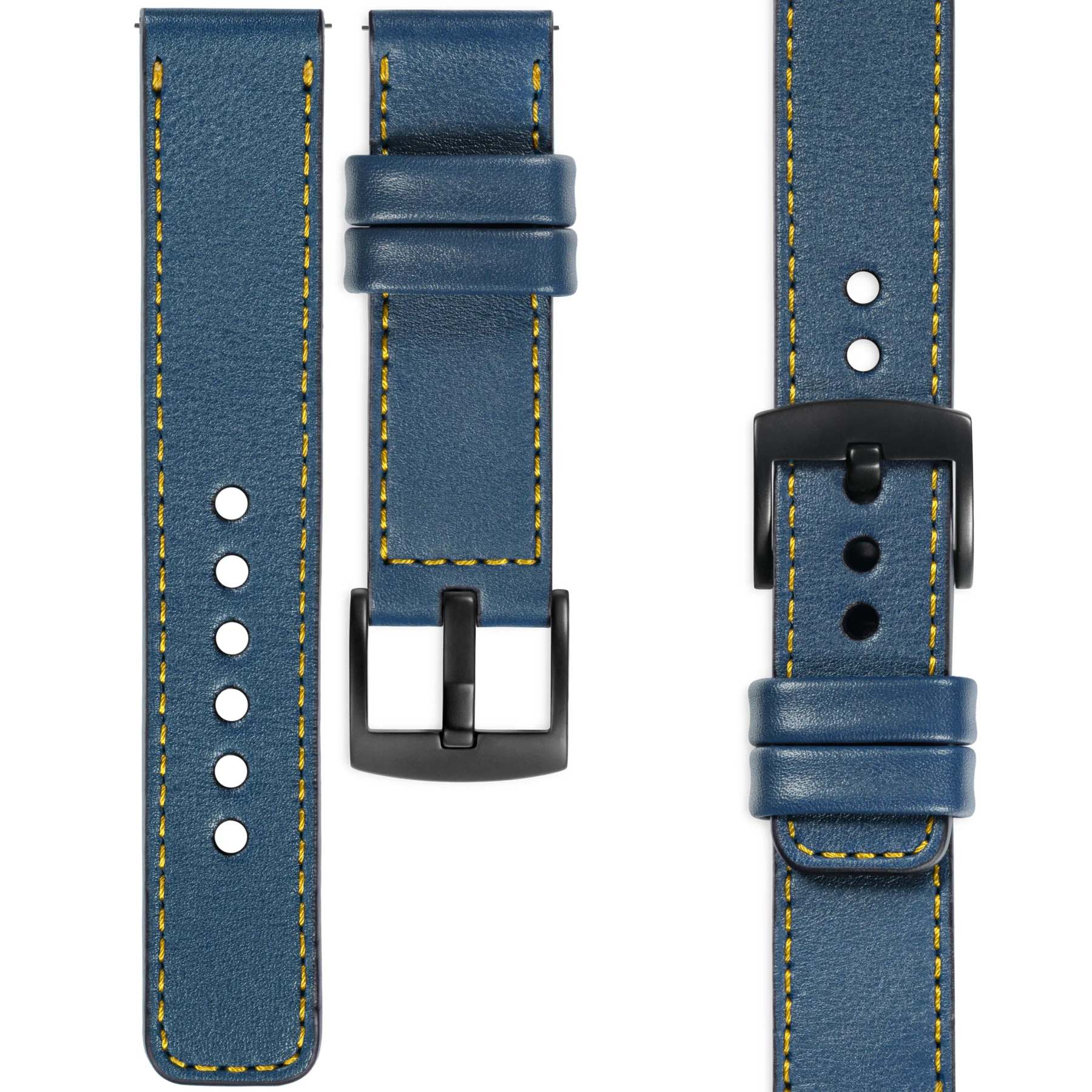moVear Prestige C1 22mm Leather strap for watch / smartwatch | Blue Jeans, elegant Yellow stitching