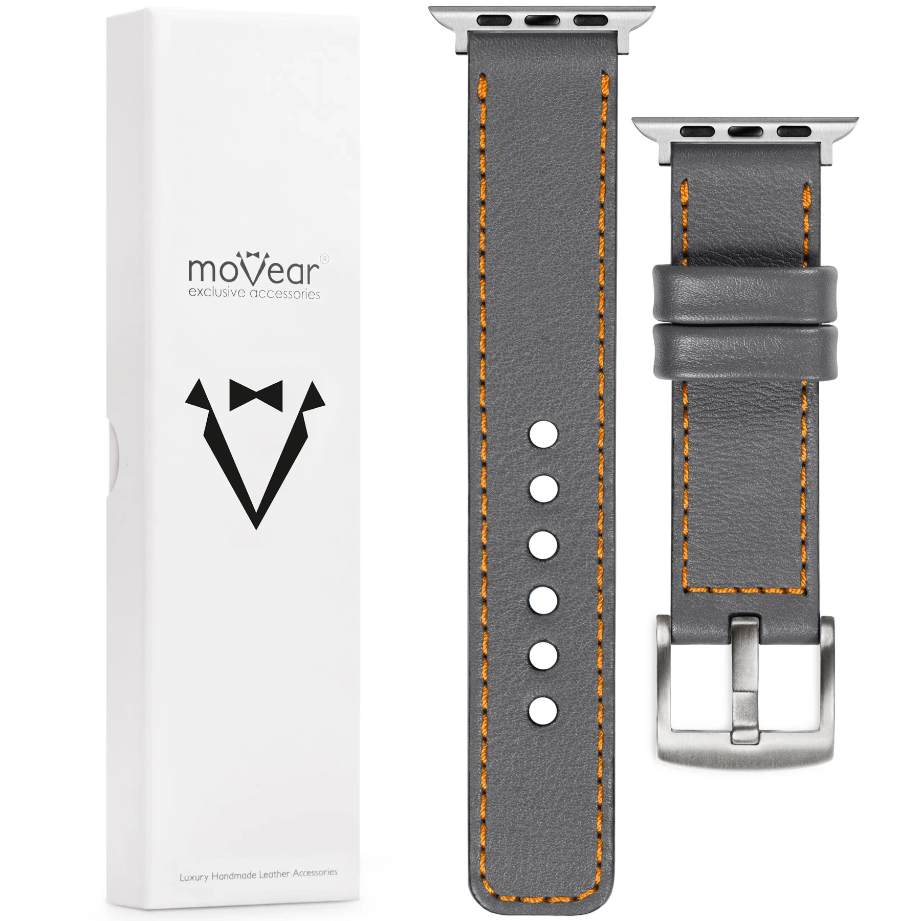 moVear Prestige C1 24mm Leather strap for Apple Watch 10 / 9 / 8 / 7 / 6 / 5 / 4 / SE (46/45/44mm) & Ultra (49mm) | Gray, elegant Orange stitching