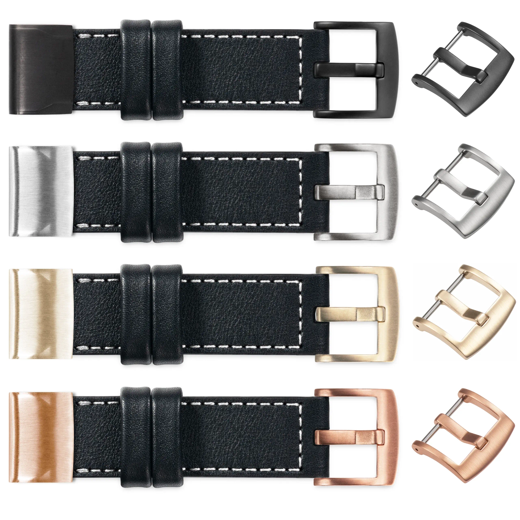 We make premium leather straps for Garmin QuickFit 20mm (Fenix / Instinct - 43/42/40mm) in many different configurations. If the default buckle and adapter (Silver) needs to be changed to a different color - we offer the following options: