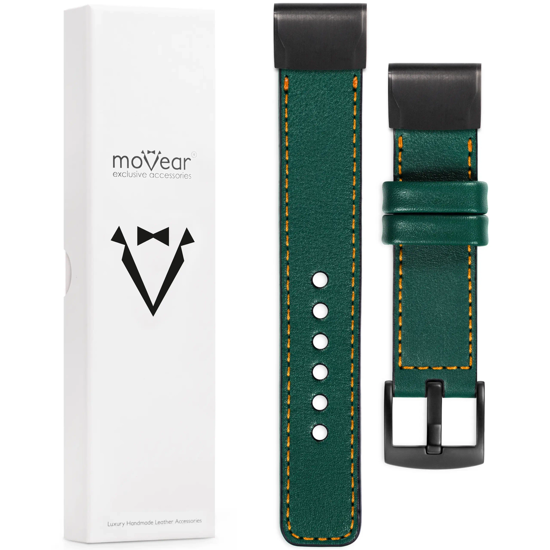 moVear Prestige C1 Leather strap for Garmin QuickFit 20mm (Fenix / Instinct - 43/42/40mm) | Bottle green, elegant Orange stitching