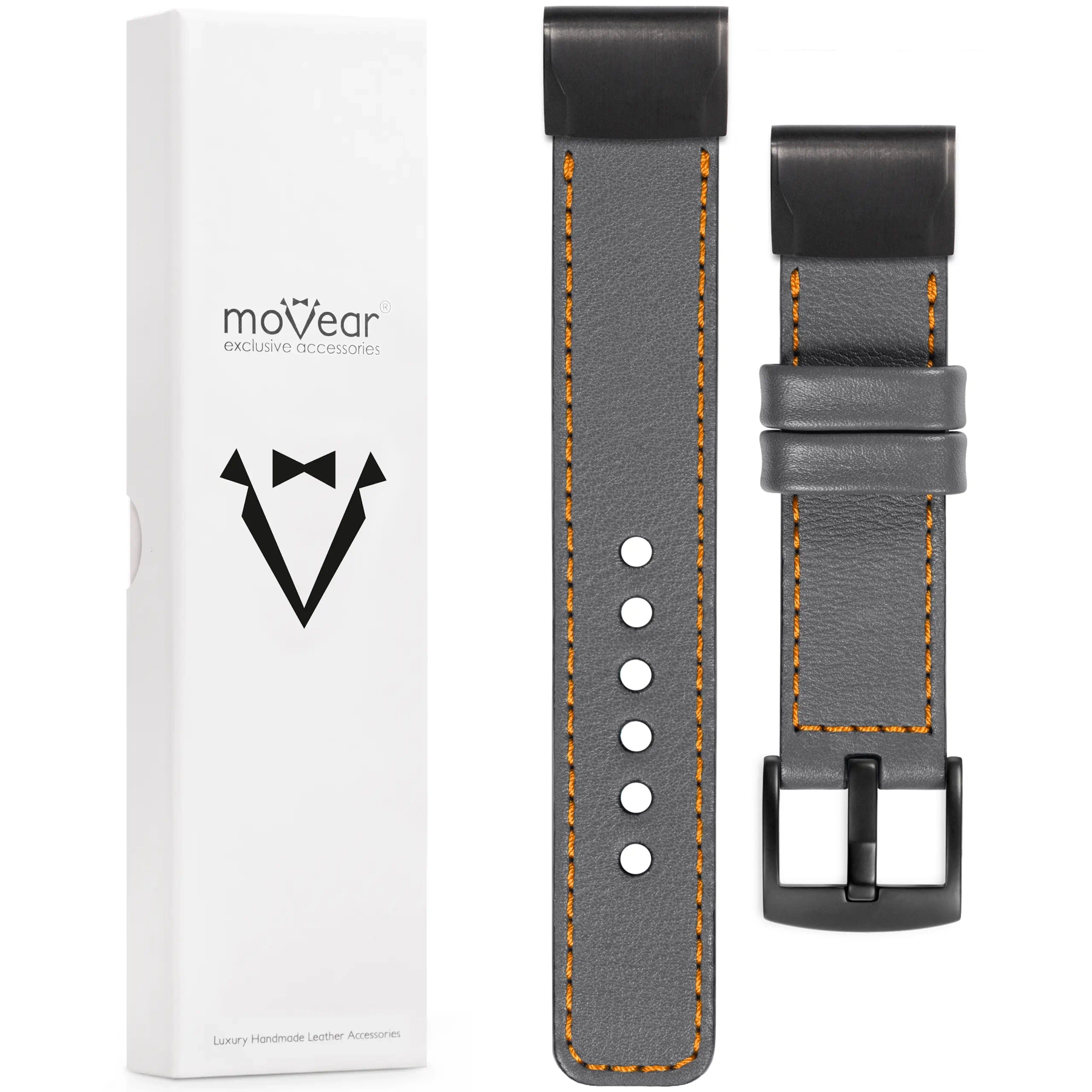 moVear Prestige C1 Leather strap for Garmin QuickFit 20mm (Fenix / Instinct - 43/42/40mm) | Gray, elegant Orange stitching
