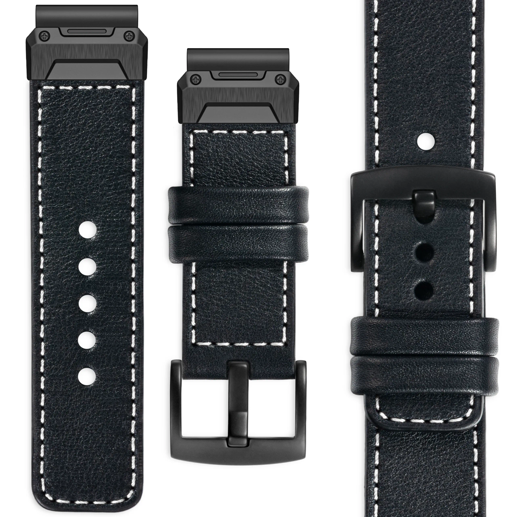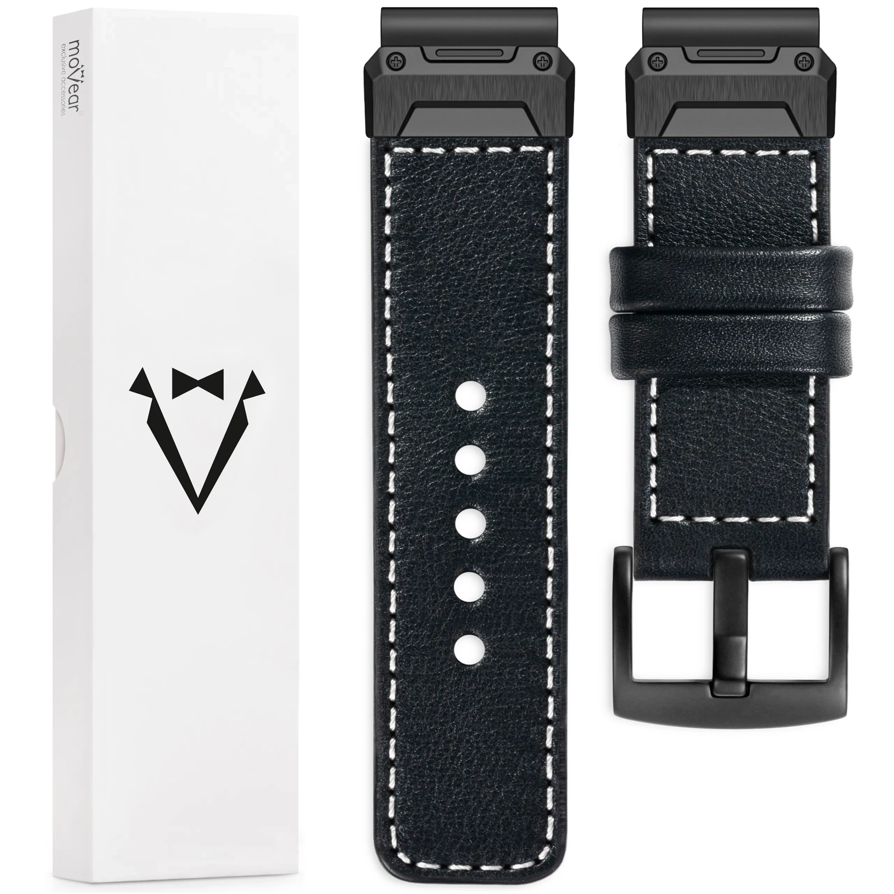 moVear Prestige C3X Leather strap for Garmin QuickFit 26mm (Fenix / Epix / Quatix / Tactix / Enduro - 51mm) | Black, elegant White stitching