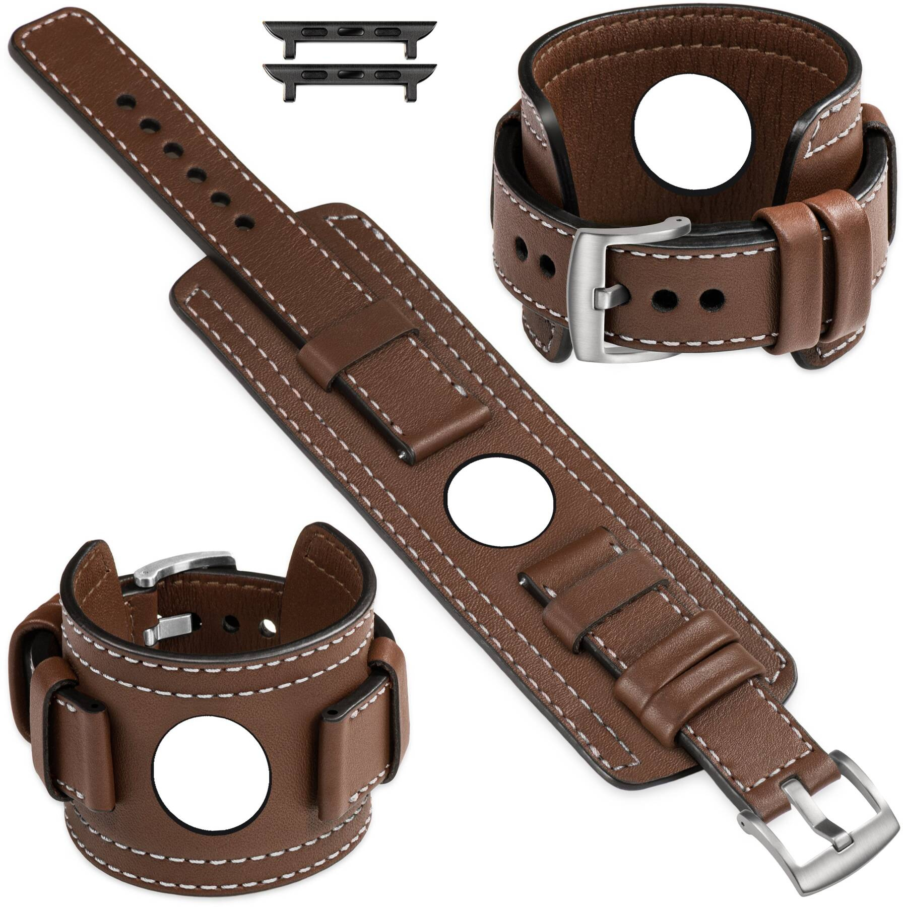 moVear Prestige CW1 24mm wide leather watch strap with pad for Apple Watch 10 / 9 / 8 / 7 / 6 / 5 / 4 / SE (46/45/44mm) & Ultra (49mm) | Dark brown, elegant White stitching