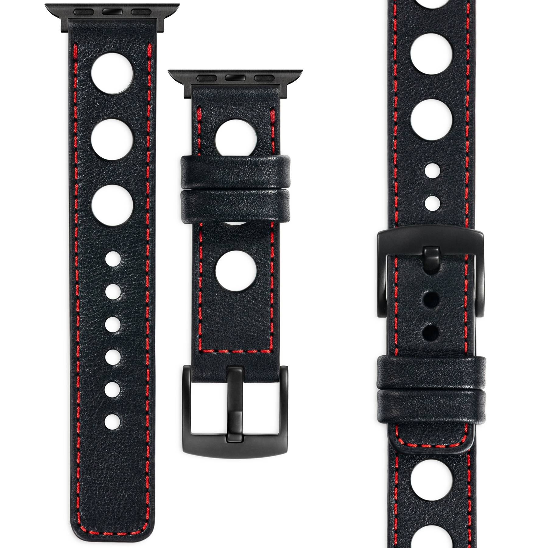 moVear Prestige R1 20mm Leather strap for Apple Watch 8 / 7 / 6 / 5 / 4 / SE (45/44mm) & Ultra (49mm) | Black, elegant Red stitching