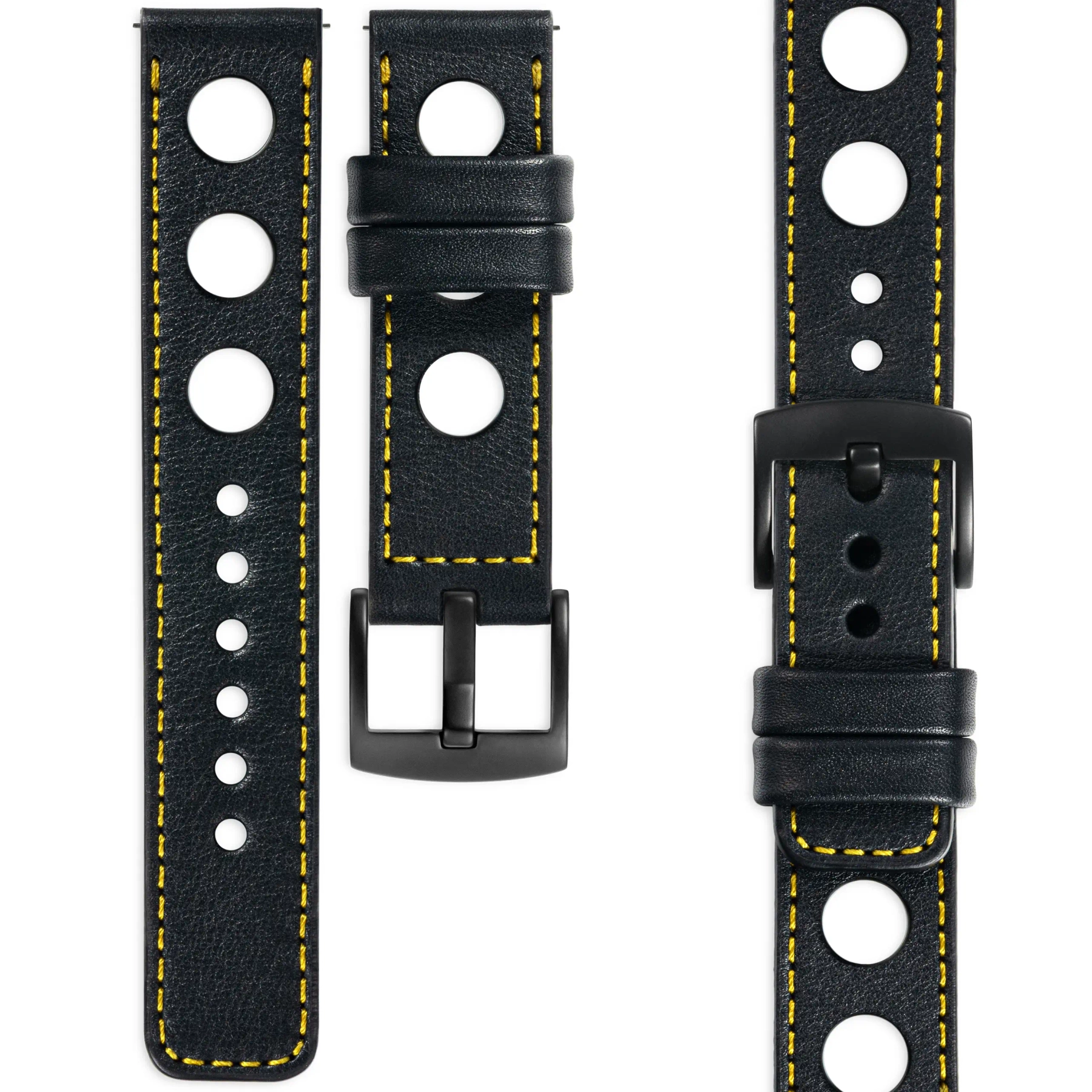 moVear Prestige R1 (Rally) 22mm Leather strap for watch / smartwatch | Black, elegant Yellow stitching