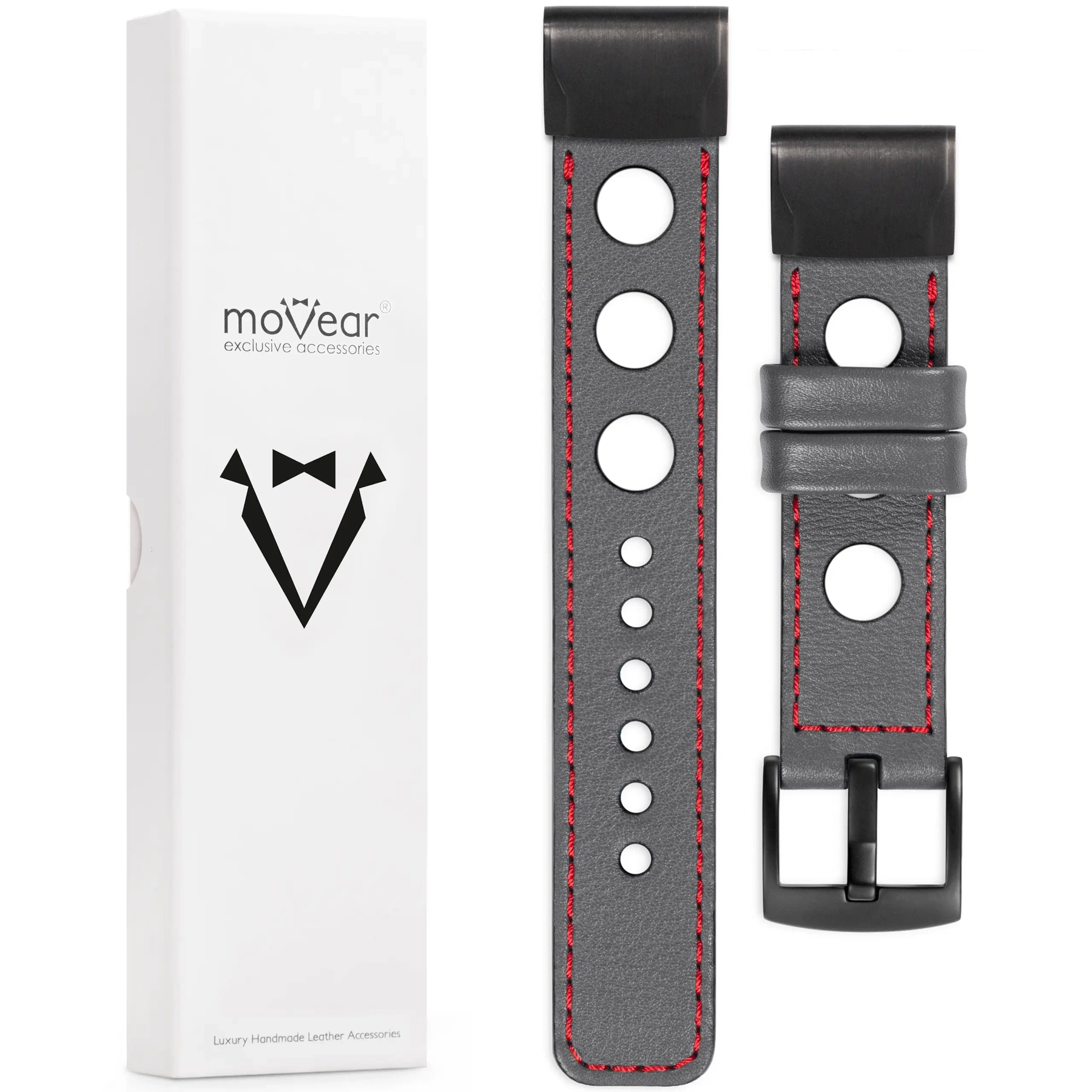moVear Prestige R1 Leather strap for Garmin QuickFit 22mm (Fenix / Forerunner / Epix / Instinct / Enduro / Quatix / MARQ - 47/45mm) | Gray, elegant Red stitching