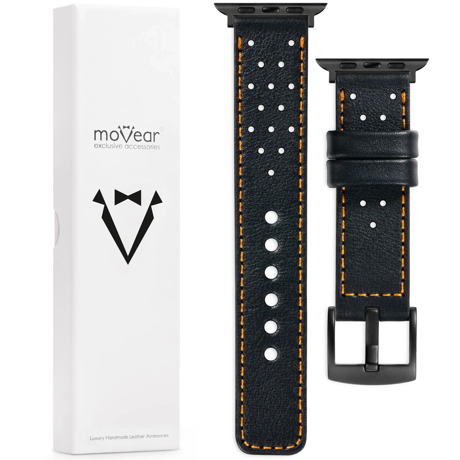 moVear Prestige R2 22mm Leather strap for Apple Watch 10 / 9 / 8 / 7 / 6 / 5 / 4 / SE (46/45/44mm) & Ultra (49mm) | Black, elegant Orange stitching