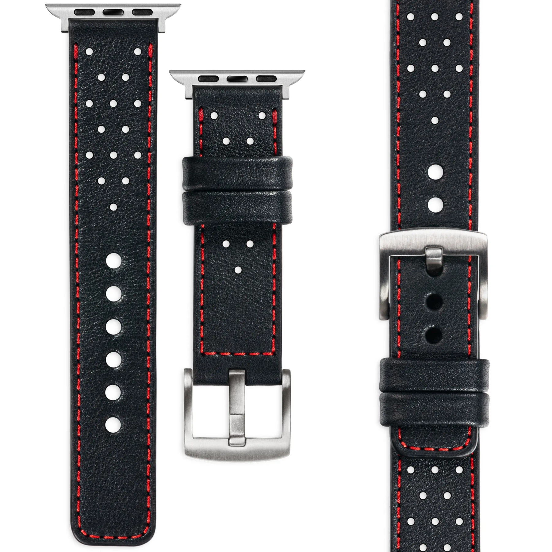 moVear Prestige R2 24mm Leather strap for Apple Watch 10 / 9 / 8 / 7 / 6 / 5 / 4 / SE (46/45/44mm) & Ultra (49mm) | Black, elegant Red stitching