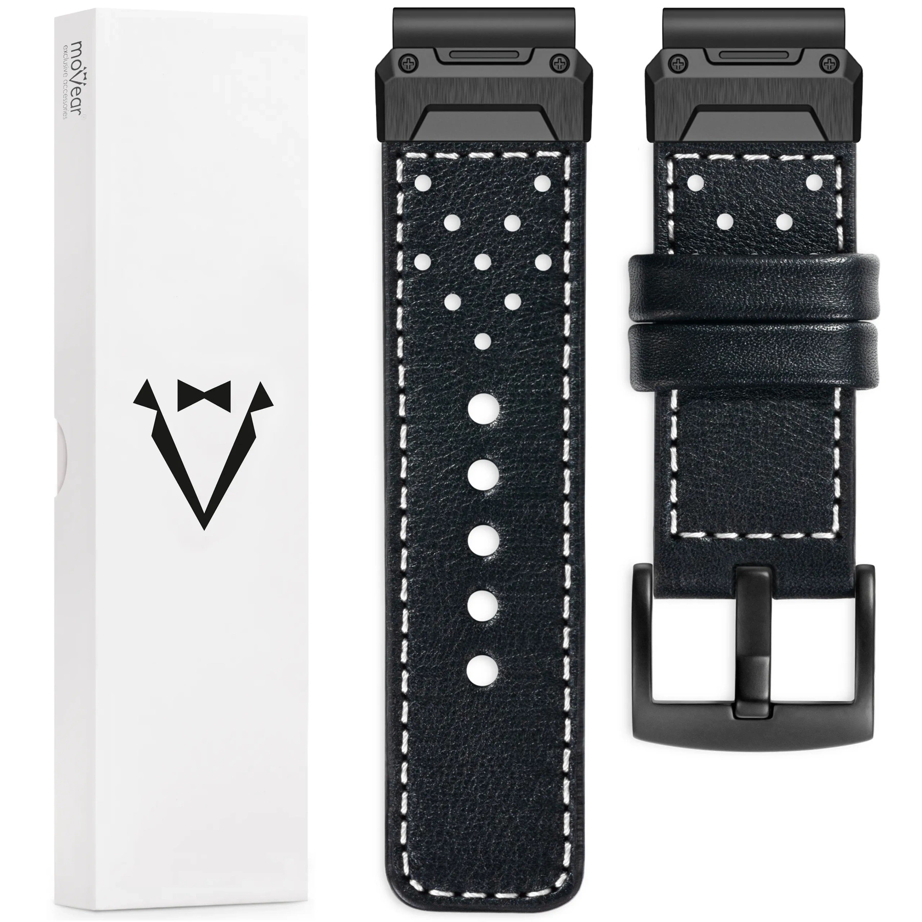 moVear Prestige R3X Leather strap for Garmin QuickFit 26mm (Fenix / Epix / Quatix / Tactix / Enduro - 51mm) | Black, elegant White stitching
