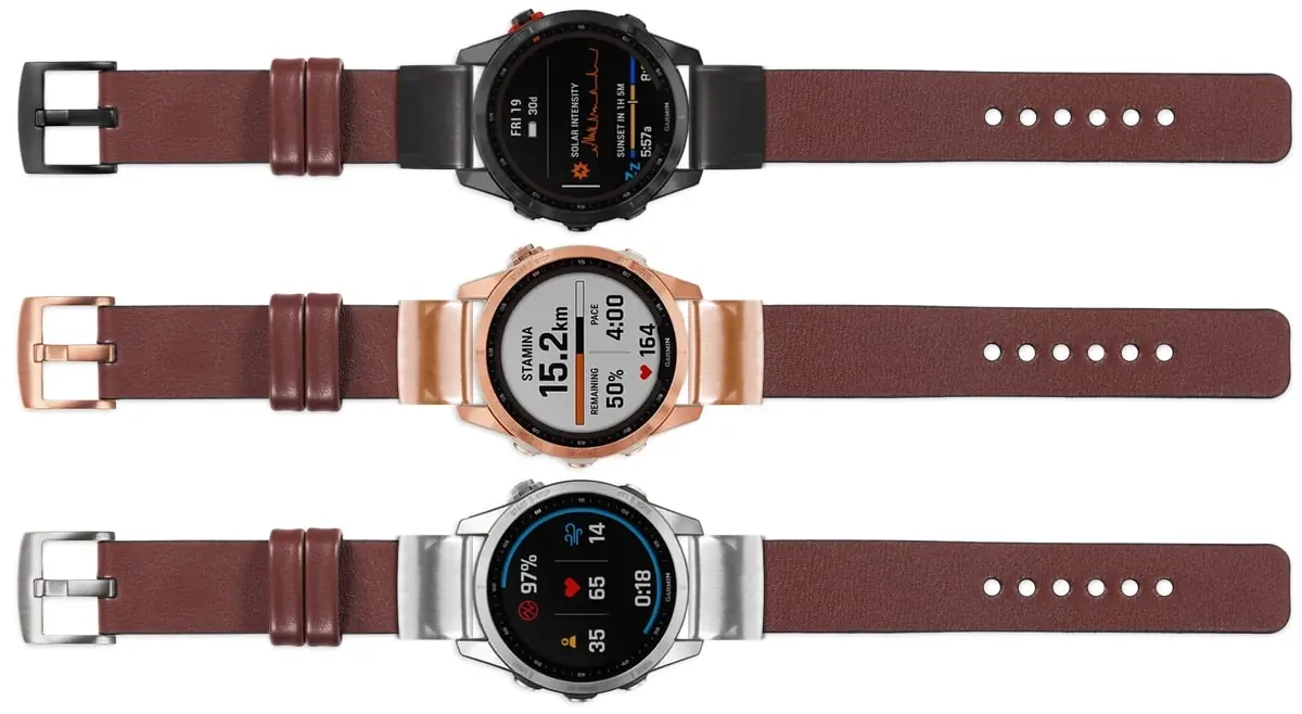 The moVear Prestige S1 leather strap for Garmin has a Quick-release adapter Garmin QuickFit 20mm. Thanks to this, changing the strap is instant and very easy. Depending on the situation, we can use an appropriate strap - for example, a silicone strap for training / sports, and a leather strap as an elegant starting strap.