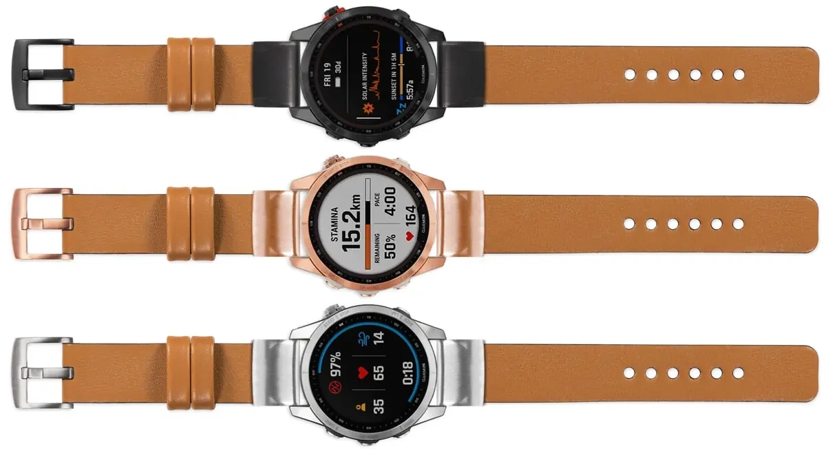 - The leather element in the strap has the width 18mm, while the mount to the watch Garmin QuickFit 20mm - 20mm
