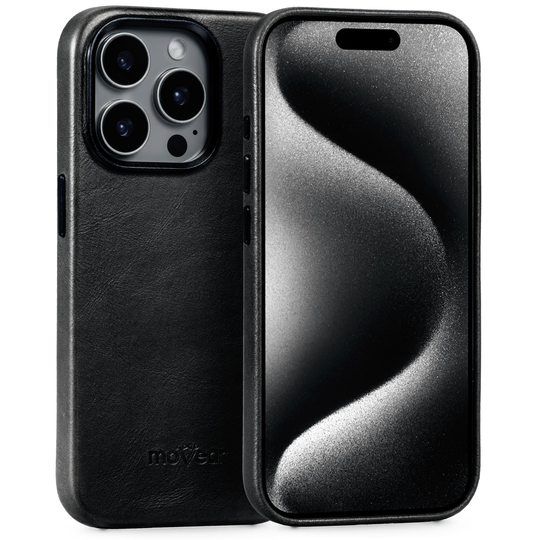 moVear backCover 4SMagSafe compatible leather back case for Apple iPhone 15 Pro Max (6.7") | Natural oiled leather, color - Black
