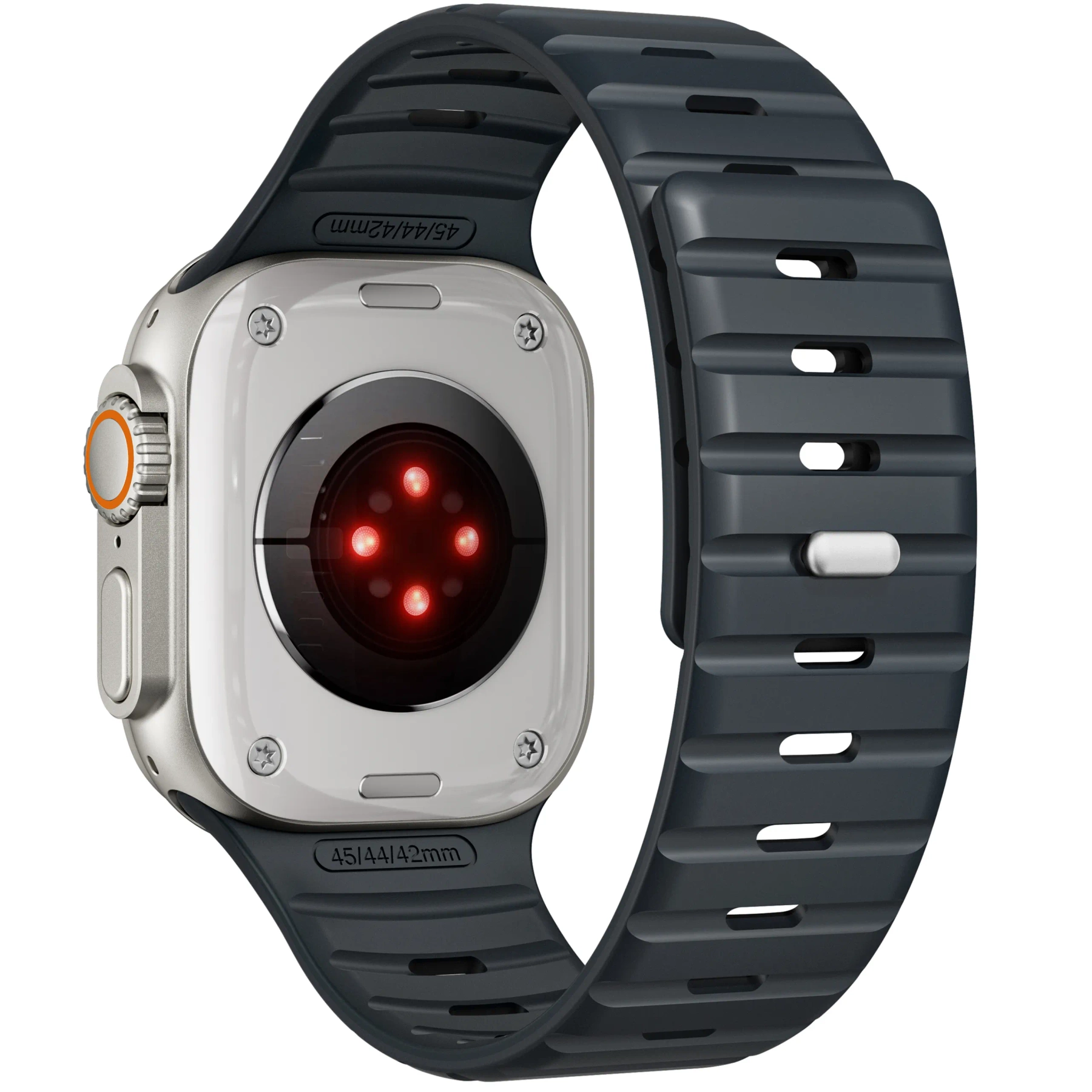 An innovative silicone strap where traditional loops are replaced with magnetic elements. The strap automatically holds in place, ensuring a perfect fit – comfortable, quick, and without unnecessary fasteners.